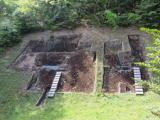 | 西谷3号墳(出雲市):大小8つ以上の墓穴。 第4主体には鉄剣と胸飾り、第1主体では200 個以上の玉類が出土。第4主体では4本柱の 跡も発見。 |